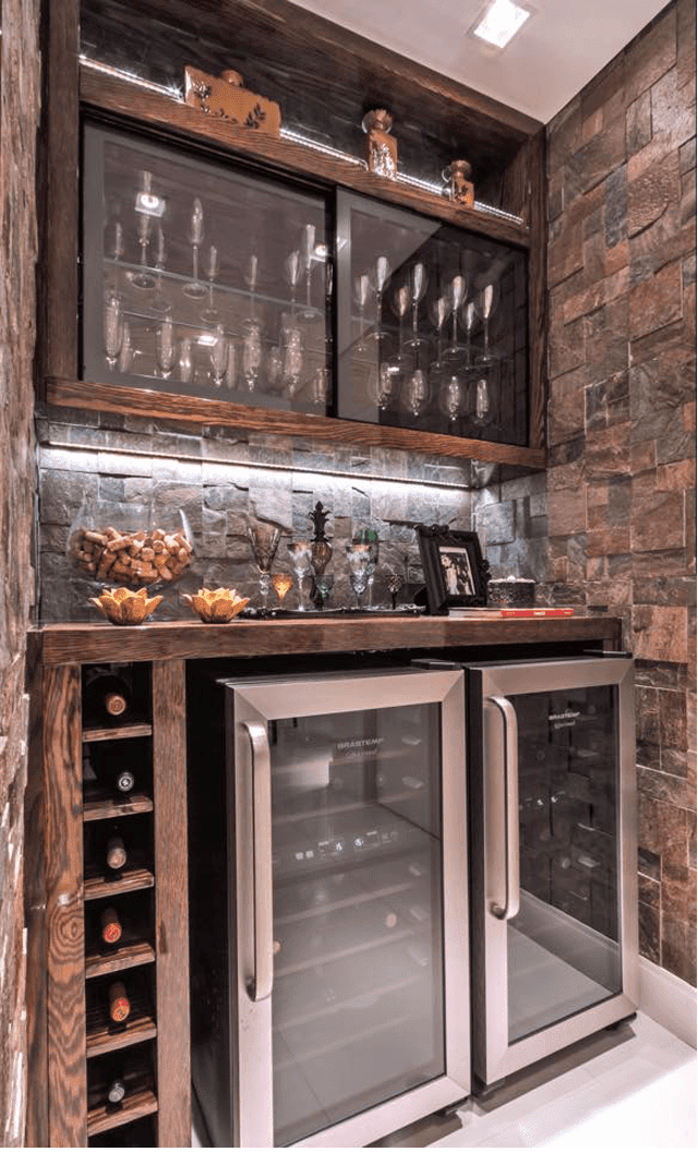 Um bar rustico que atende todas as necessidades de armazenamento de bebidas, louças e acessórios num armário embutido sob medida com espaço para adega.
